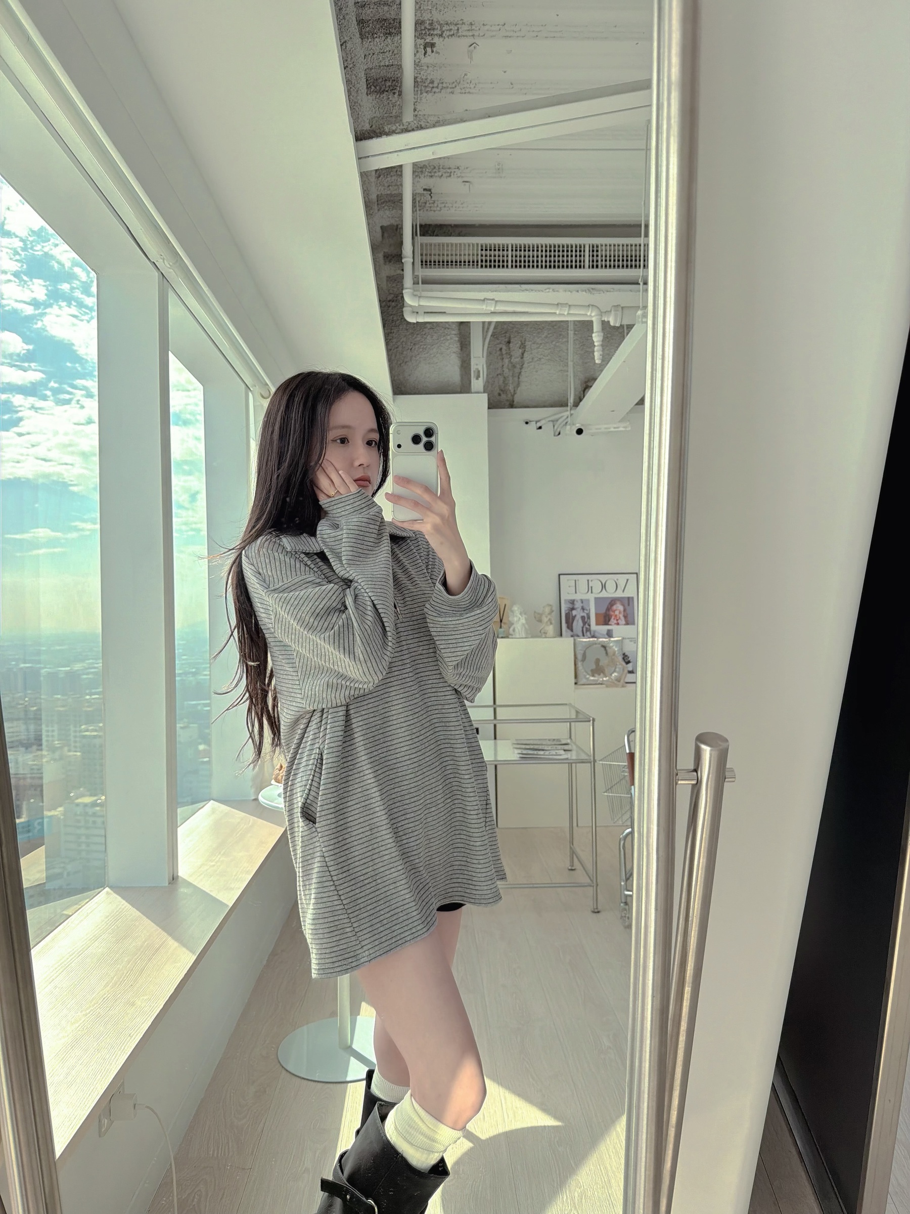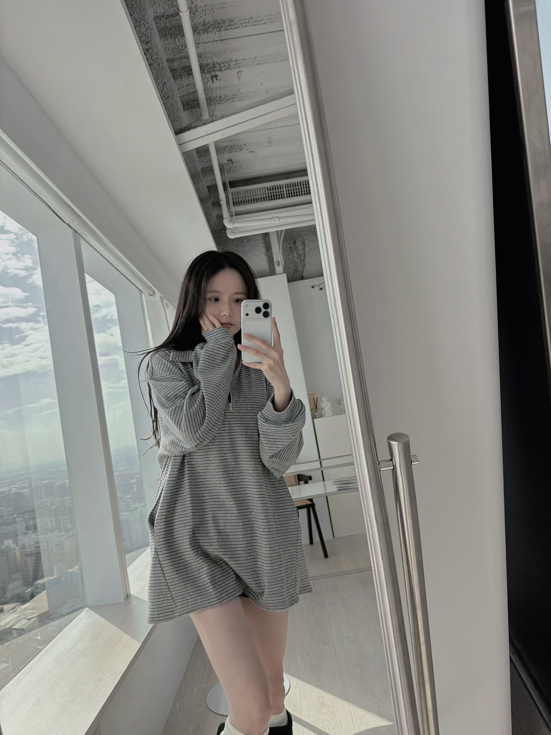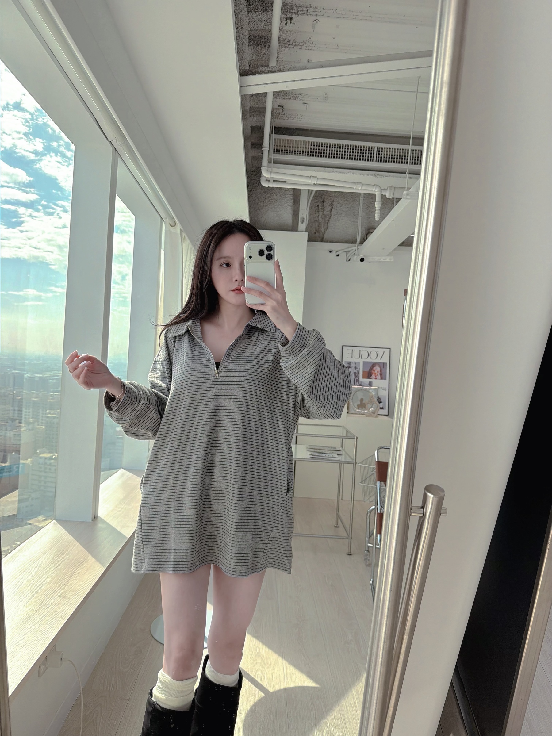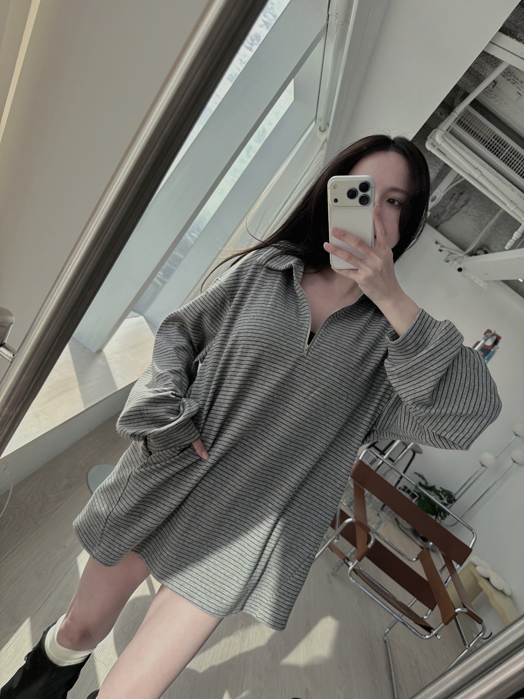 復古細條紋半拉鍊長版上衣